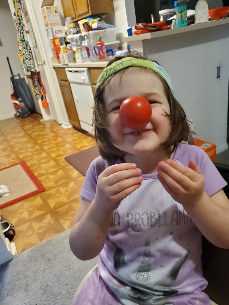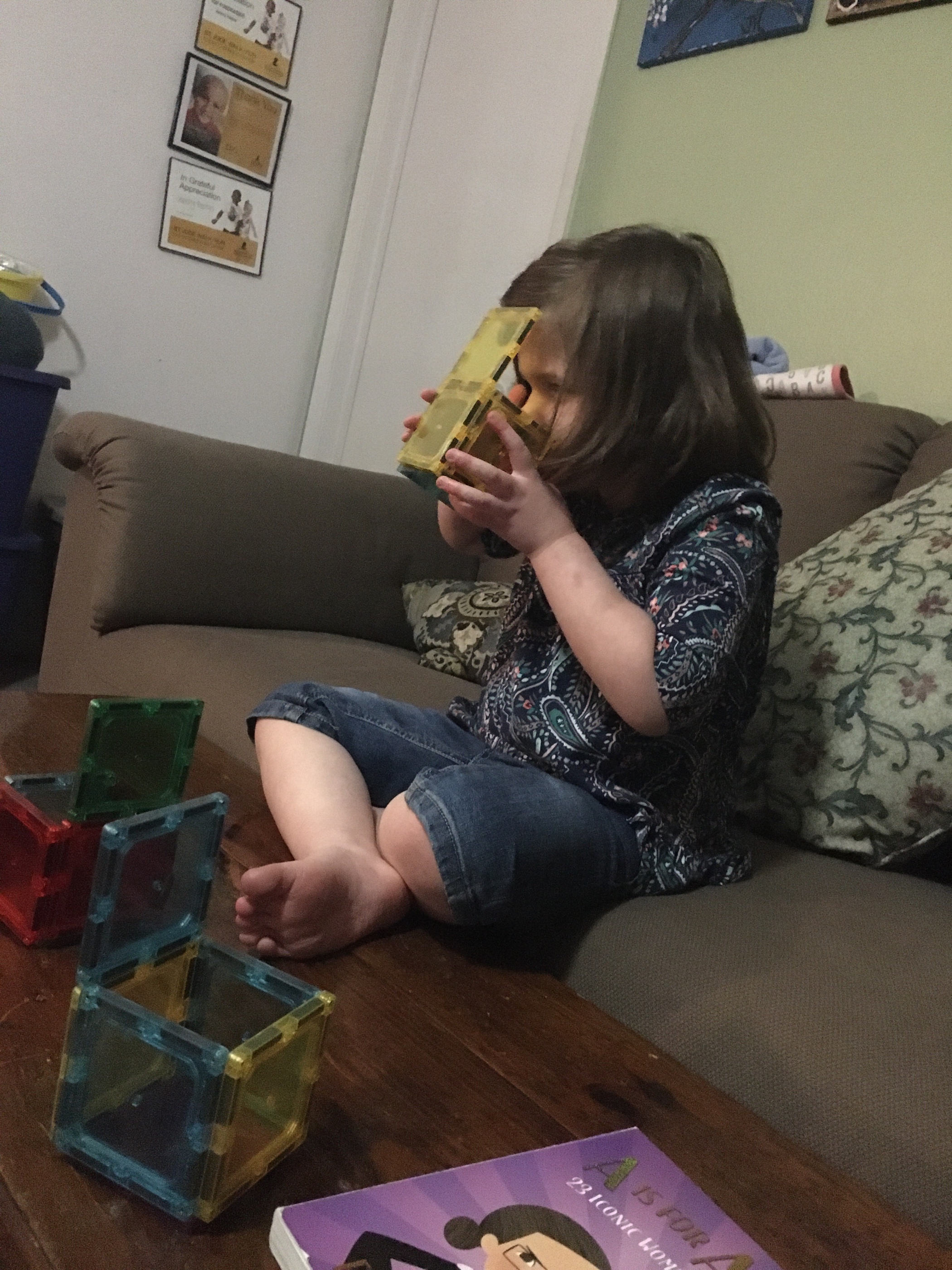 You love doing puzzles and you are so good at them whether it’s on Mom’s phone or a good old-fashioned box puzzle, you have such an innate understanding of how things fit together. You still love to color and playing with your tiles, you have such an imagination when it comes to what color things are and are not, for example this is a picture of you “drinking” a box of juice.