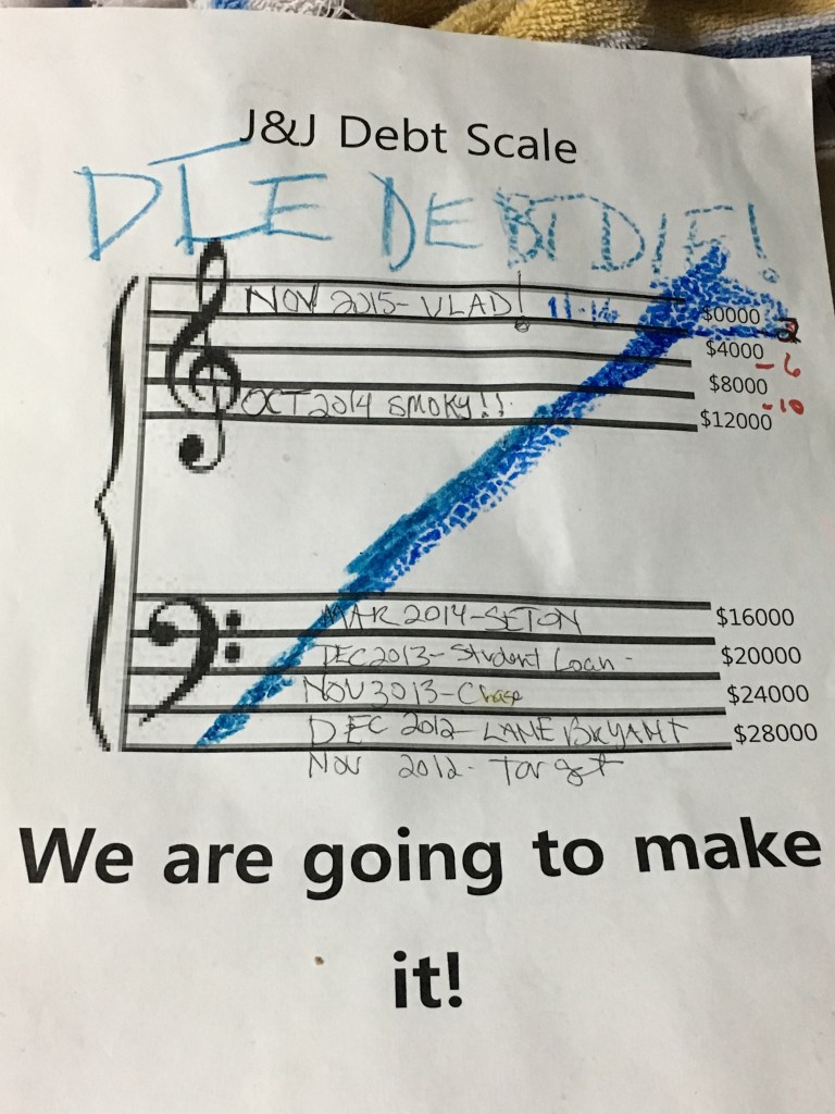 Cars, School loans, and many a regret later, a 401K loan. (Boy howdy, do I regret that one!) but it was done! In fact, that was our first debt we paid back to my parents. Told you it was a regret.
